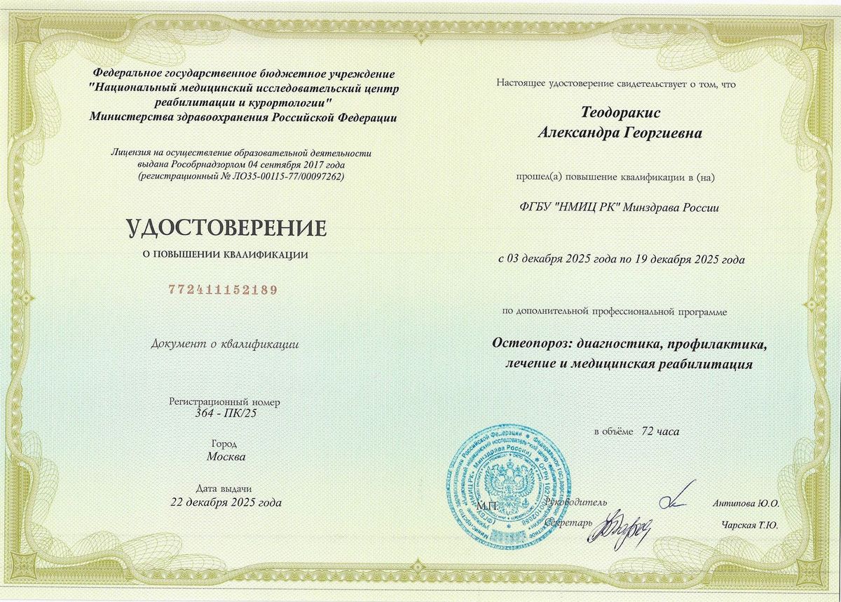 - 12.2025 г. Удостоверение о повышении квалификации. ФГБУ “НМИЦ РК” Минздрава России. «Остеопороз: диагностика, профилактика, лечение и медицинская реабилитация»
