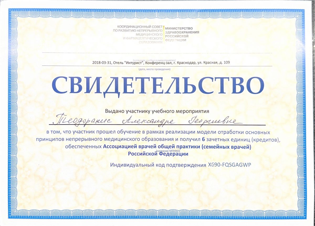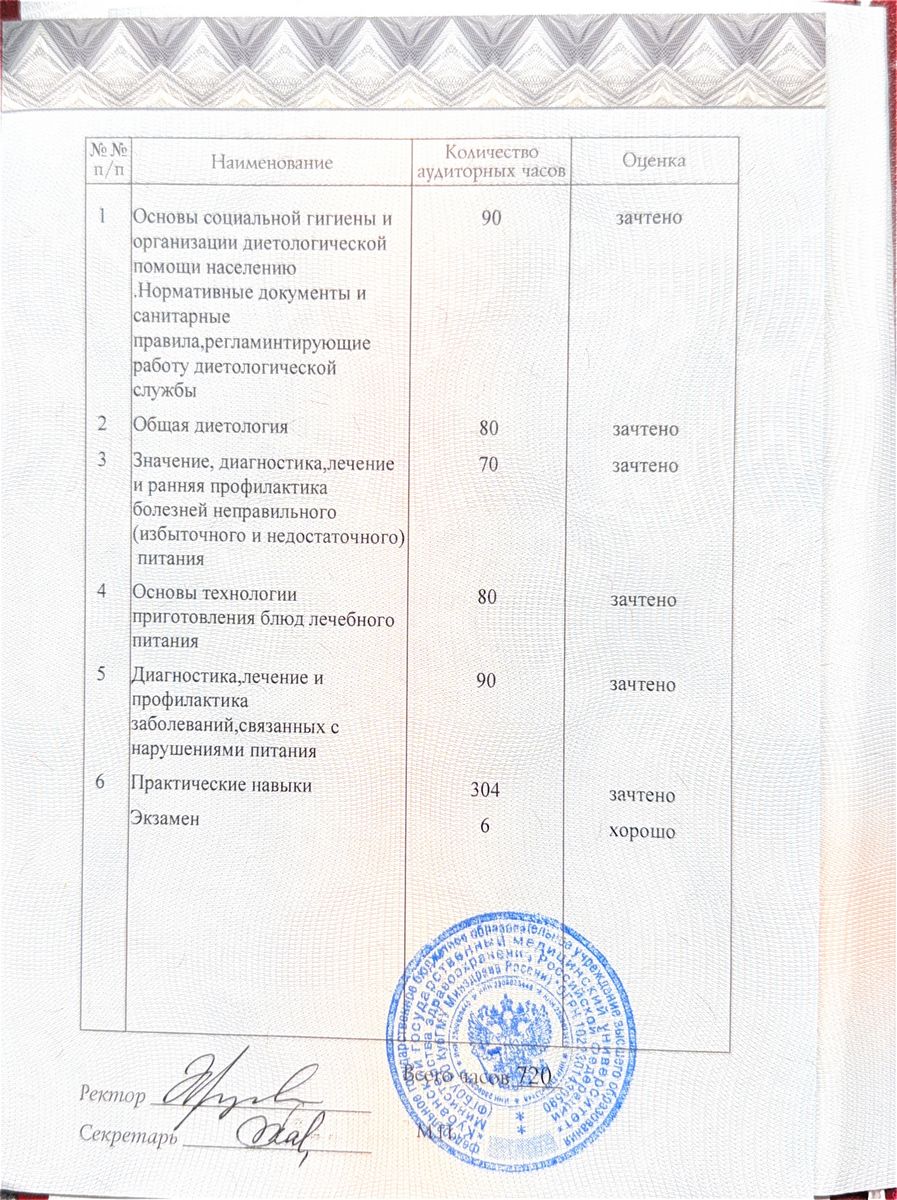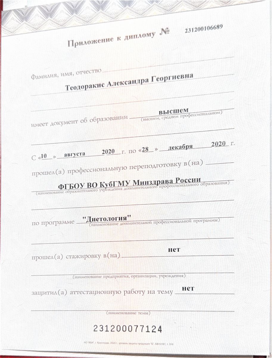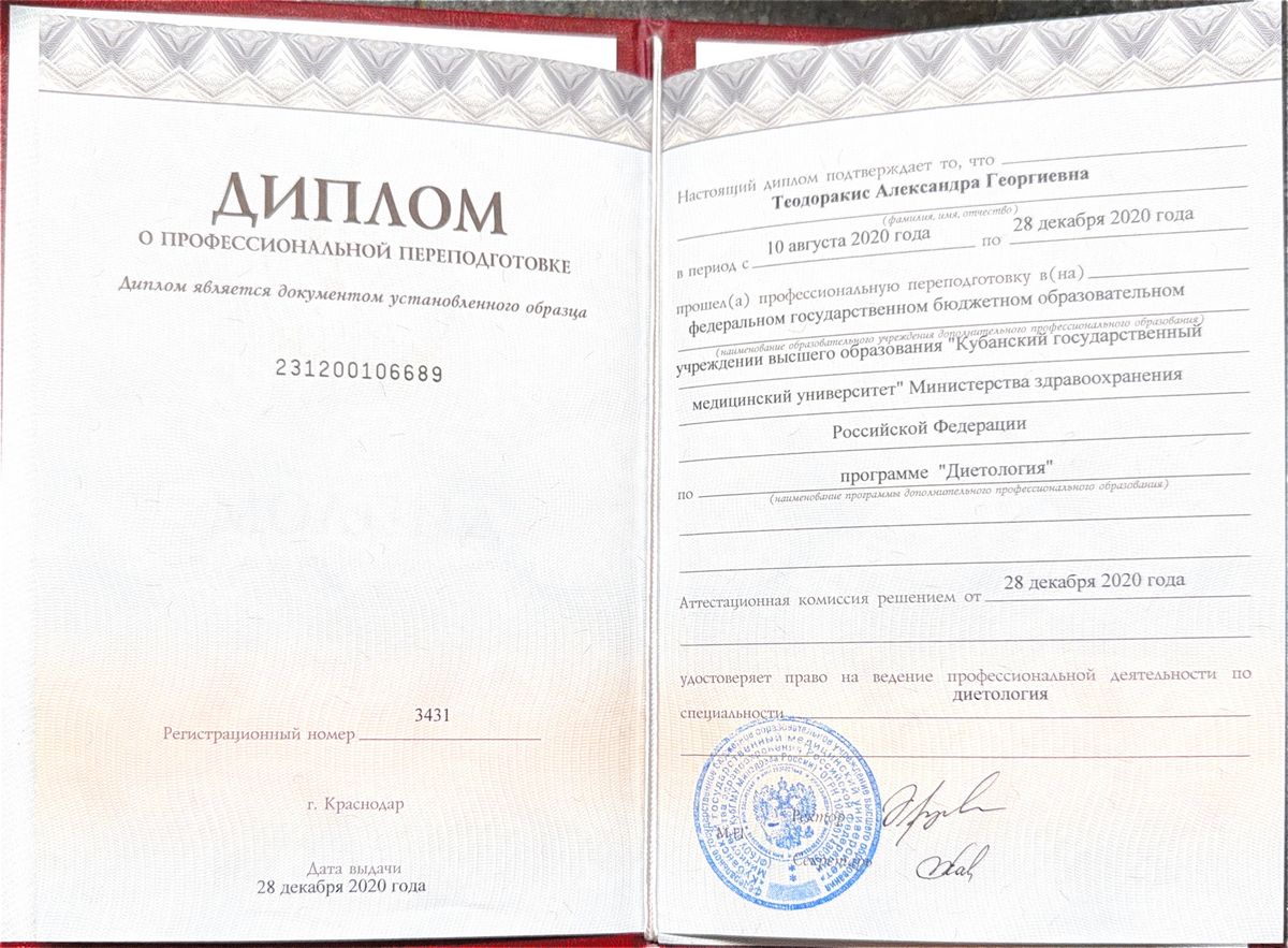 - 12.2020 г. Диплом о профессиональной переподготовке по специальности «Диетология». Кубанский государственный медицинский университет. г. Краснодар