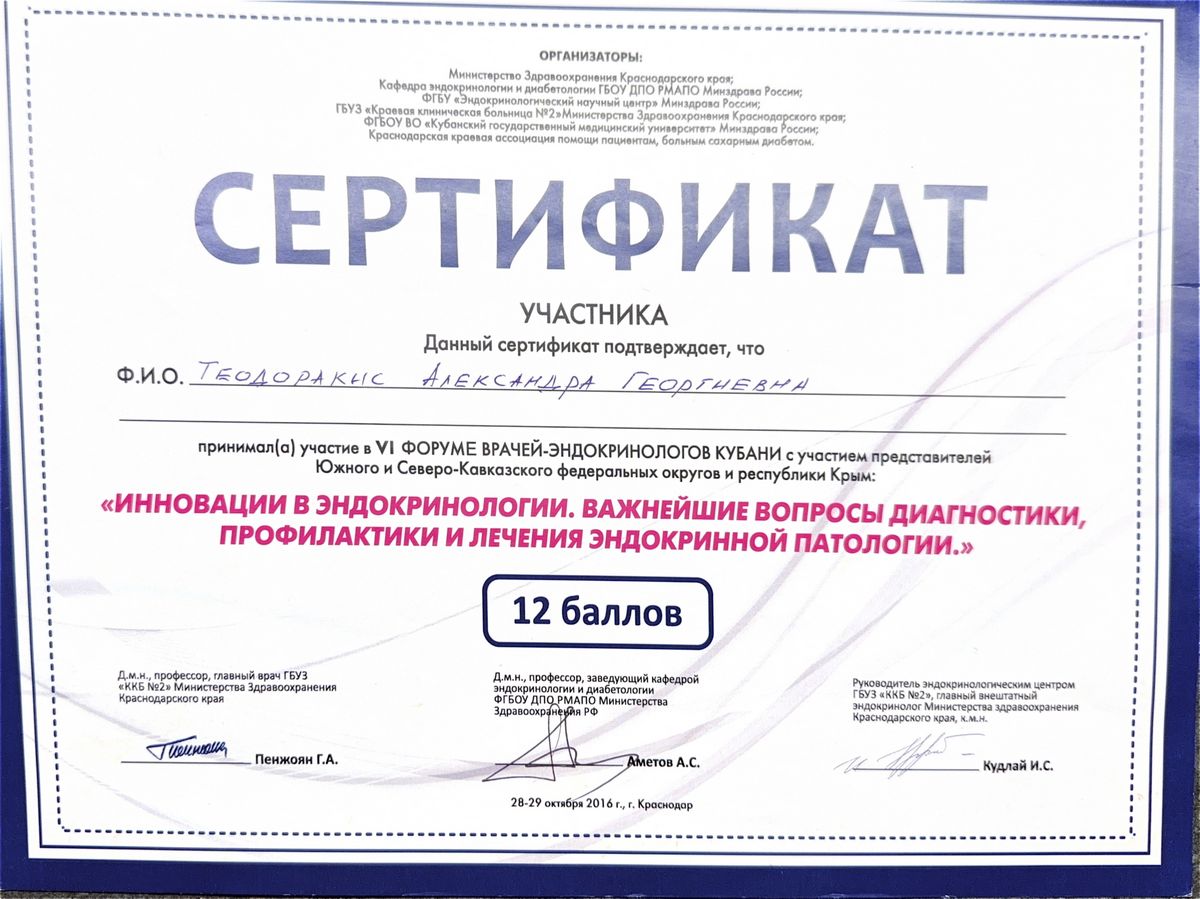 - 07.2015 г. Повышение квалификации по специальности «Эндокринология» Кубанский государственный медицинский университет. г. Краснодар