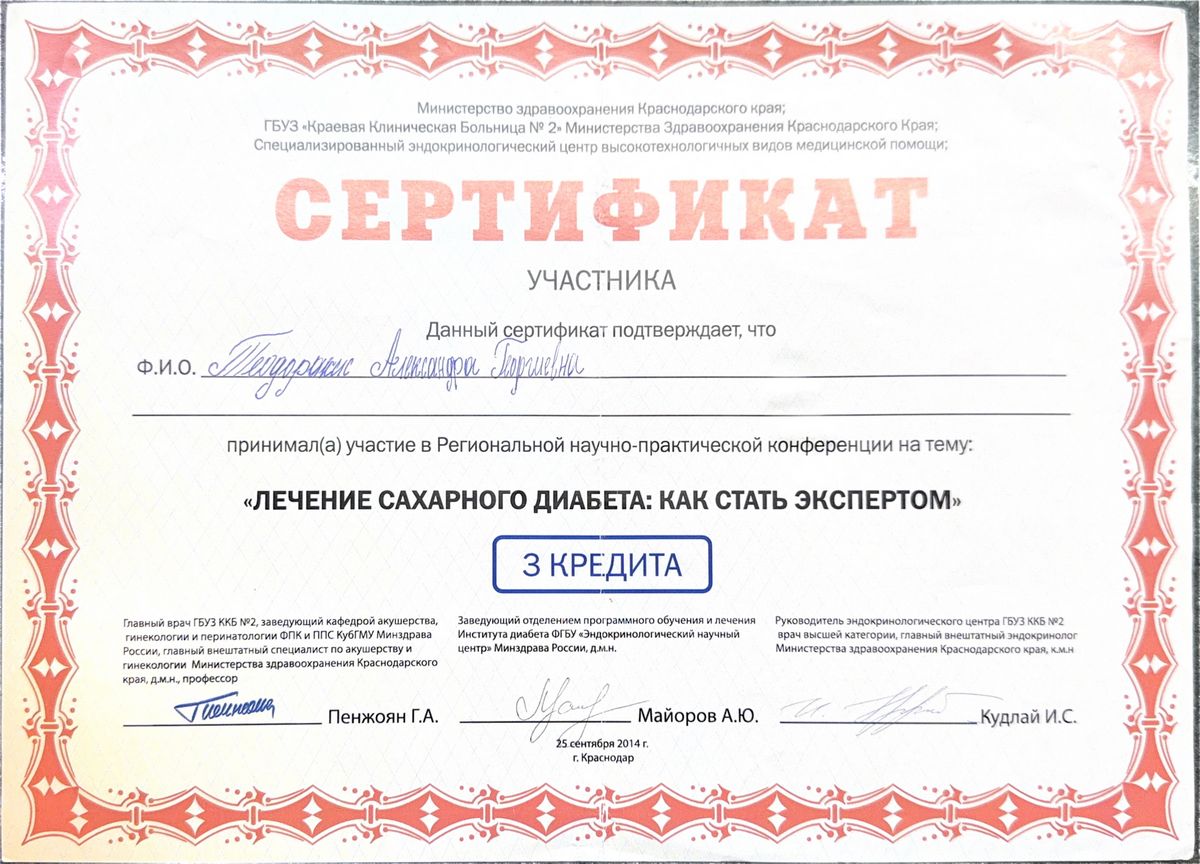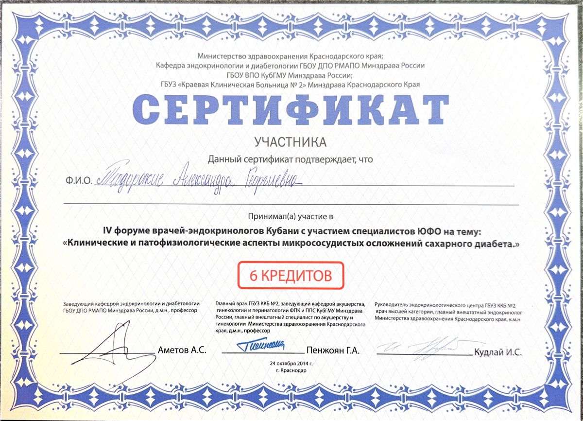 - 10.2014 г. Участие в форуме врачей-эндокринологов Кубани на тему «Клинические и патофизиологические аспекты микрососудистых осложнений сахарного диабета» г. Краснодар.