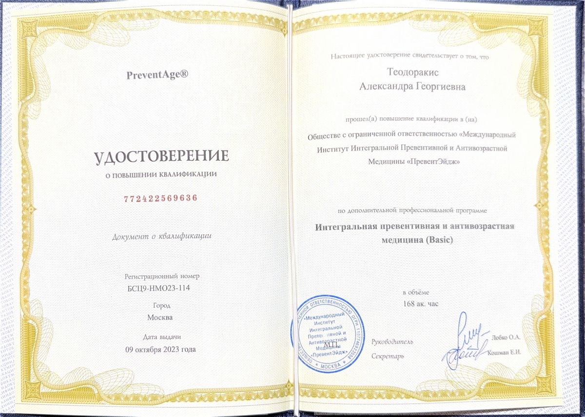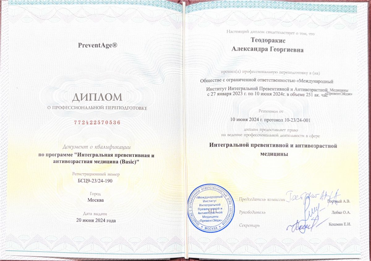 - С 27.01.2023г. по 10.06.2024г.Обучение в институте Интегральной Превентивной и Антивозрастной медицине. ПревентЭйдж. Диплом о профессиональной переподготовке. г. Москва.