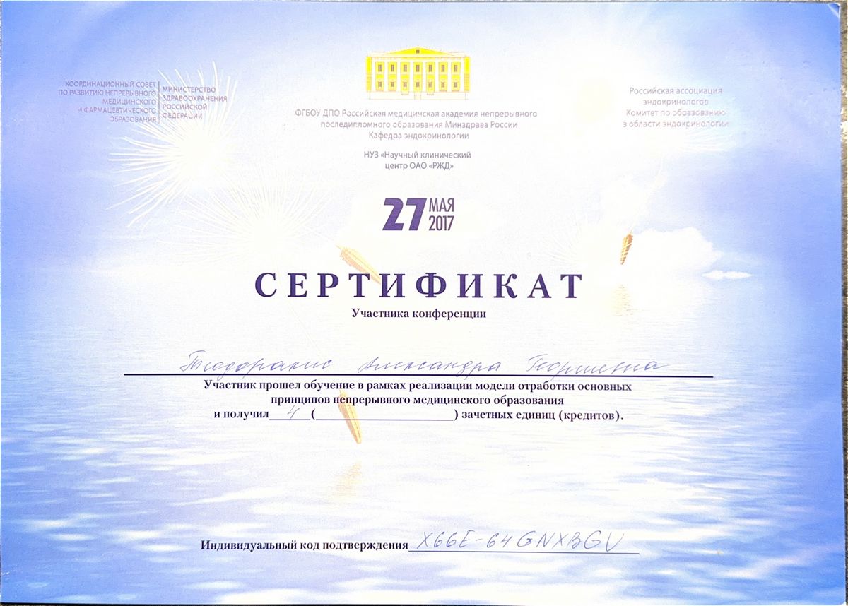 - 03.2020 г. Повышение квалификации по специальности «Эндокринология». Многопрофильный Учебный центр Дополнительного медицинского образования «образовательный стандарт» г. Москва